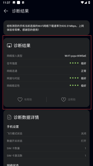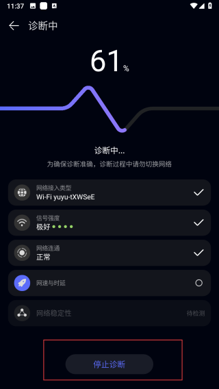 4、診斷結(jié)束后,在診斷結(jié)果頁面查看網(wǎng)絡(luò)接入類型,信號強(qiáng)度等詳細(xì)的網(wǎng)絡(luò)狀態(tài)信息。