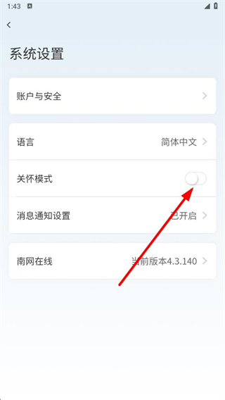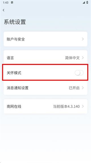 4、點擊其右側(cè)的開關按鈕,開啟關懷模式開關后,即可啟用該模式。