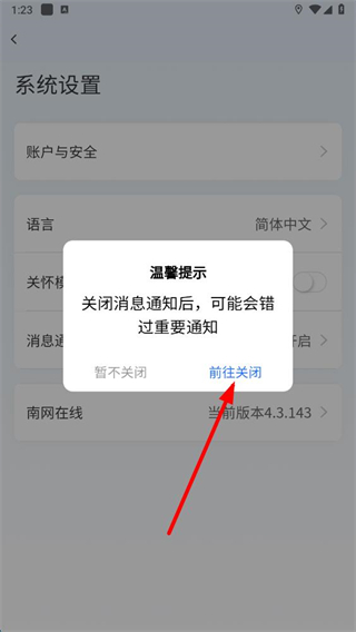 4、在彈出的溫馨提示框中,點擊前往關閉按鈕,按照提示完成操作即可關閉消息通知。