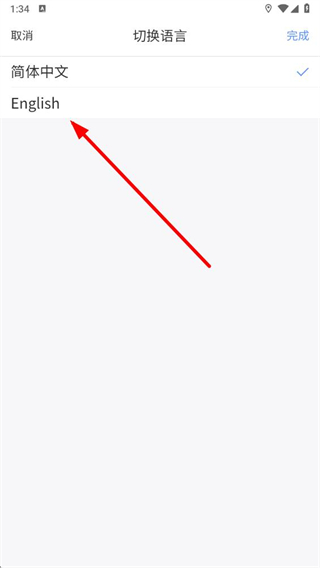 4、在切換語言頁面選擇English,再點擊右上角的完成按鈕,即可切換為英文模式。