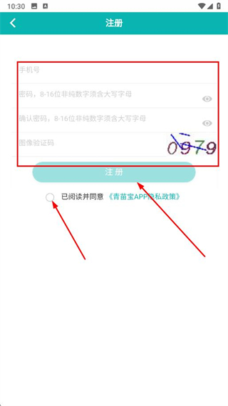4、輸入手機號等信息,勾選同意隱私政策,點擊注冊。