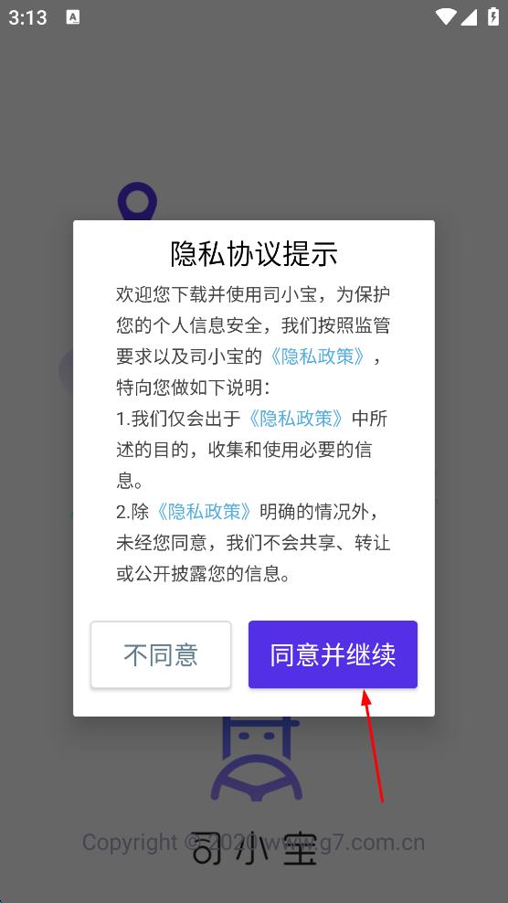 1、打開司小寶App,在隱私協(xié)議提示頁(yè)面,點(diǎn)擊“同意并繼續(xù)”按鈕。