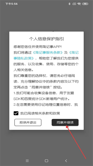 1、打開簡記事APP,進(jìn)入時會彈出個人信息保護指引,點擊同意并繼續(xù)的按鈕。
