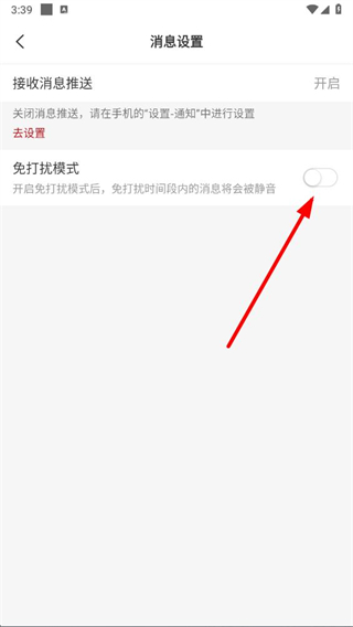 4、在消息設(shè)置頁面點(diǎn)擊免打擾模式開關(guān),即可開啟免打擾模式。