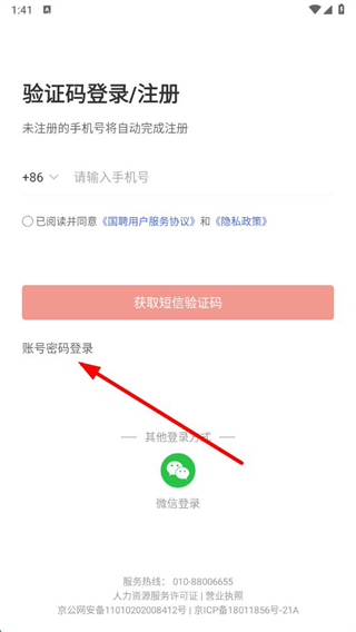 1、在國聘驗(yàn)證碼登錄注冊頁面,點(diǎn)擊賬號密碼登錄選項(xiàng)切換登錄模式。