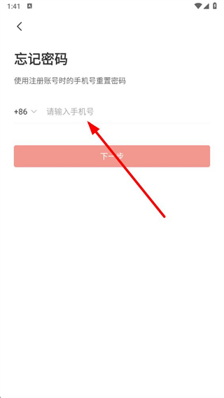 3、在忘記密碼頁面,輸入注冊時的手機(jī)號,點(diǎn)擊下一步按提示重置密碼。