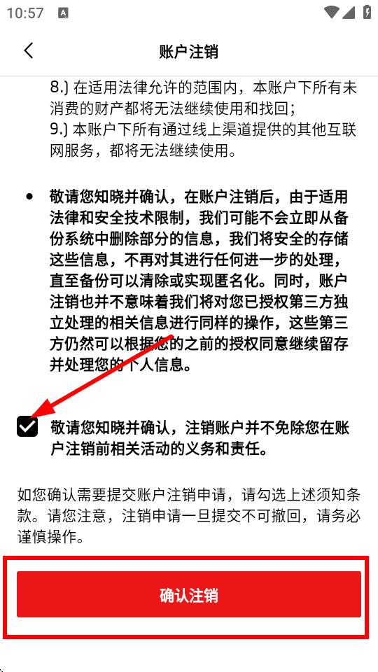 5、仔細(xì)閱讀賬戶注銷的相關(guān)提醒和條款,勾選同意相關(guān)須知后,點擊確認(rèn)注銷,按照后續(xù)提示完成注銷操作。