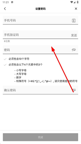 4、在設(shè)置密碼頁面,填寫手機號、獲取并輸入驗證碼,設(shè)置新密碼,完成后點擊完成即可重置密碼。