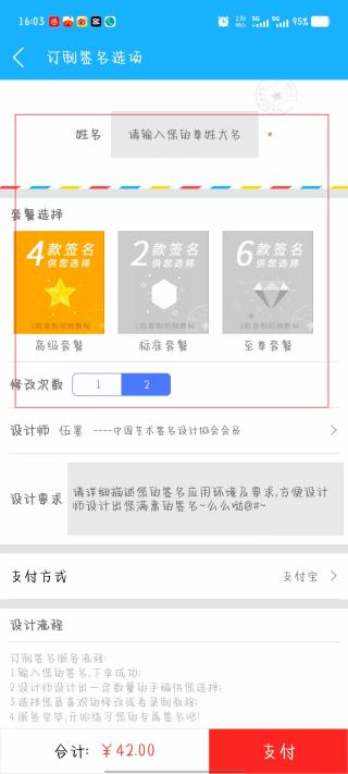 3、進(jìn)入訂制簽名表單頁(yè)面,填寫(xiě)需定制簽名的姓名,選擇對(duì)應(yīng)的套餐,也可補(bǔ)充設(shè)計(jì)要求等內(nèi)容。