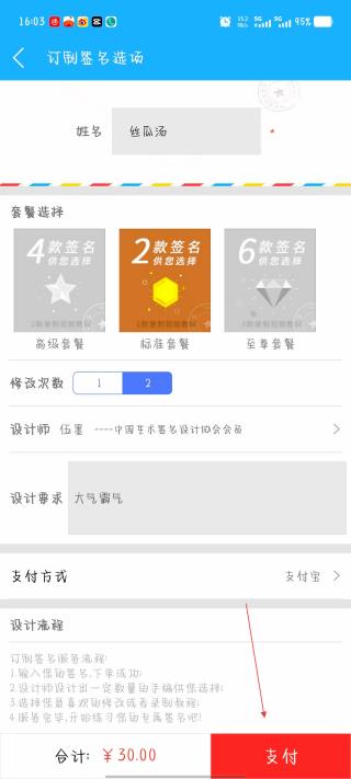 4、填好姓名、選好套餐并補(bǔ)充設(shè)計(jì)要求后,點(diǎn)擊頁(yè)面下方的支付按鈕,完成付款即可定制專(zhuān)屬藝術(shù)簽名。