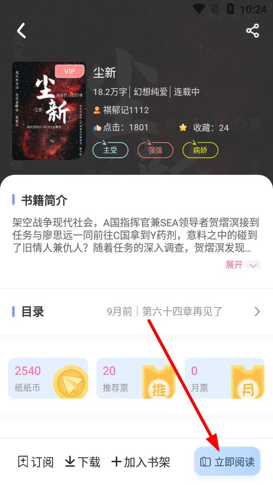 2、進入小說塵新詳情頁,點擊立即閱讀開始閱讀小說內(nèi)容。