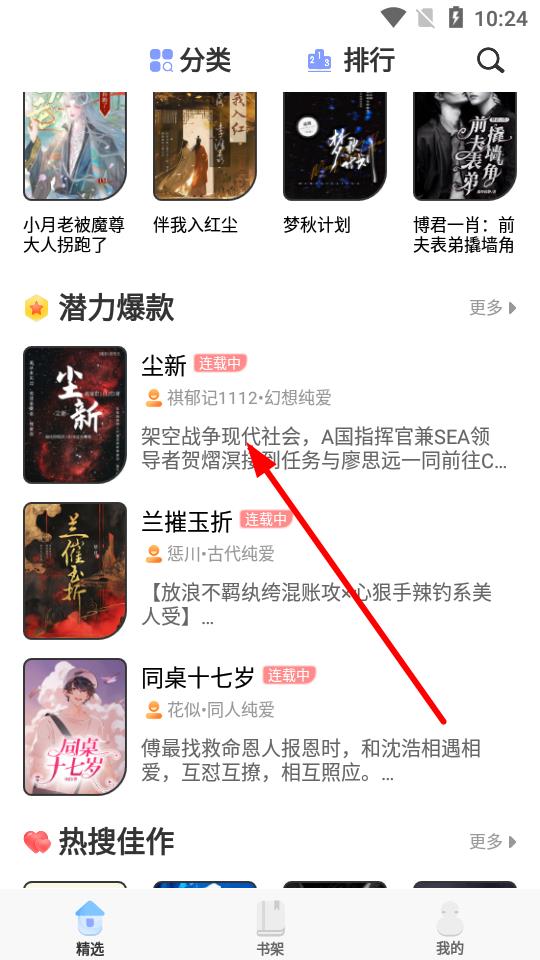 1、打開一紙小說APP,在精選頁面選擇想閱讀的小說,如塵新。