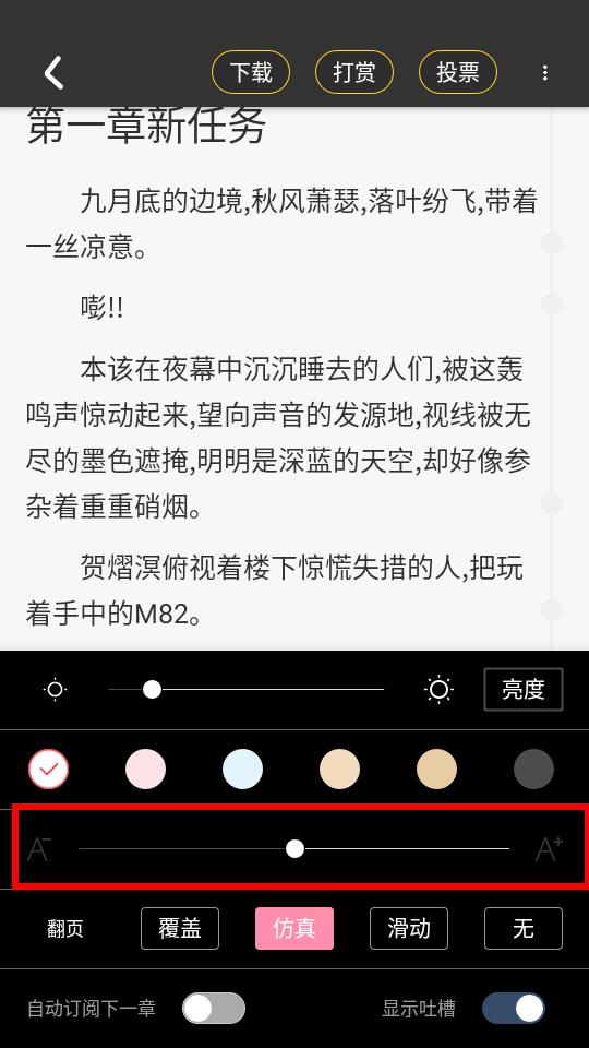 4、在設(shè)置菜單中,找到字體大小調(diào)節(jié)滑塊,通過拖動滑塊即可更改小說字體大小。