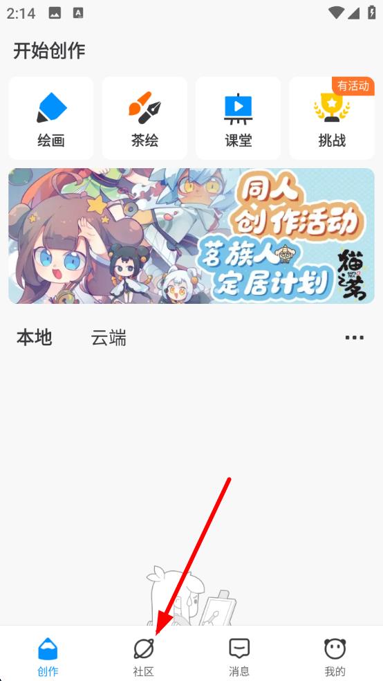 1、打開熊貓繪畫,點(diǎn)擊底部社區(qū)選項(xiàng),進(jìn)入社區(qū)交流頁面。