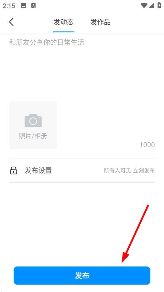 3、在發(fā)動態(tài)頁面,填寫內(nèi)容、添加照片等,完成后點(diǎn)擊發(fā)布按鈕,即可發(fā)布動態(tài)。
