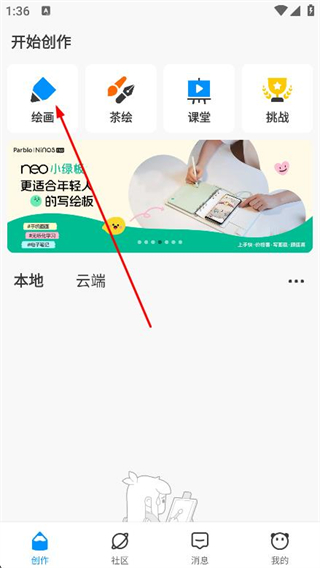 1、打開熊貓繪畫app,點(diǎn)擊上方的繪畫選項(xiàng)。
