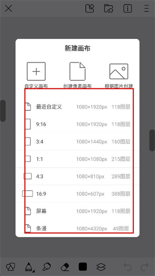 2、在新建畫布頁面,選擇需要的畫布尺寸。