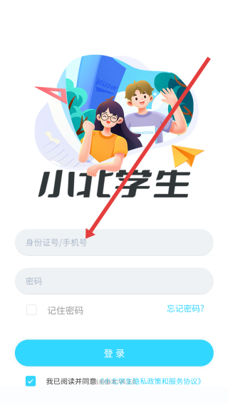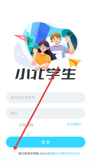 2、進(jìn)入小北學(xué)生登錄界面,要先勾選我已閱讀并同意條款,再進(jìn)行賬號密碼填寫或其他操作。