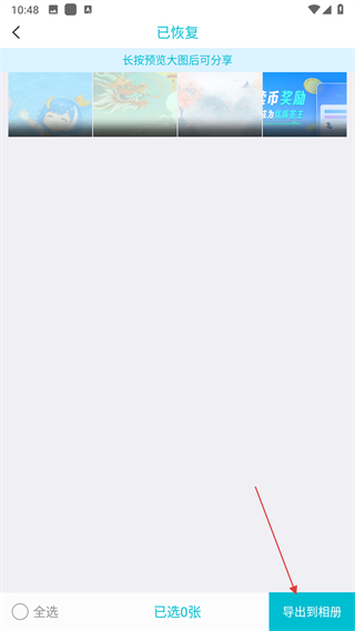 4、恢復(fù)完成后,進(jìn)入已恢復(fù)頁面,確認(rèn)照片恢復(fù)成功,然后點(diǎn)擊導(dǎo)出到相冊(cè)按鈕。