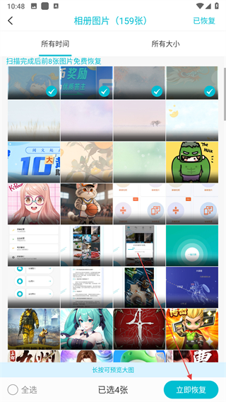 3、在相冊照片界面,瀏覽顯示的圖片縮略圖,勾選需要恢復(fù)的照片,選好后點(diǎn)擊立即恢復(fù)。