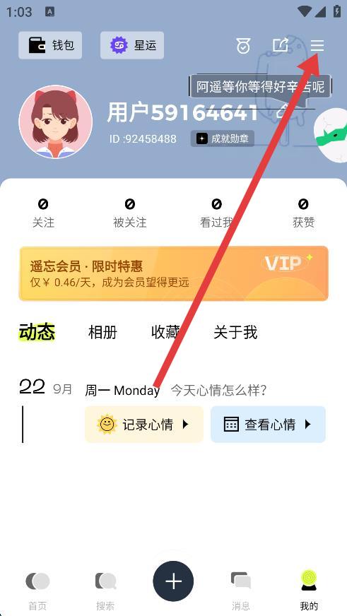 2、在我的頁面右上角,找到并點(diǎn)擊菜單圖標(biāo)。