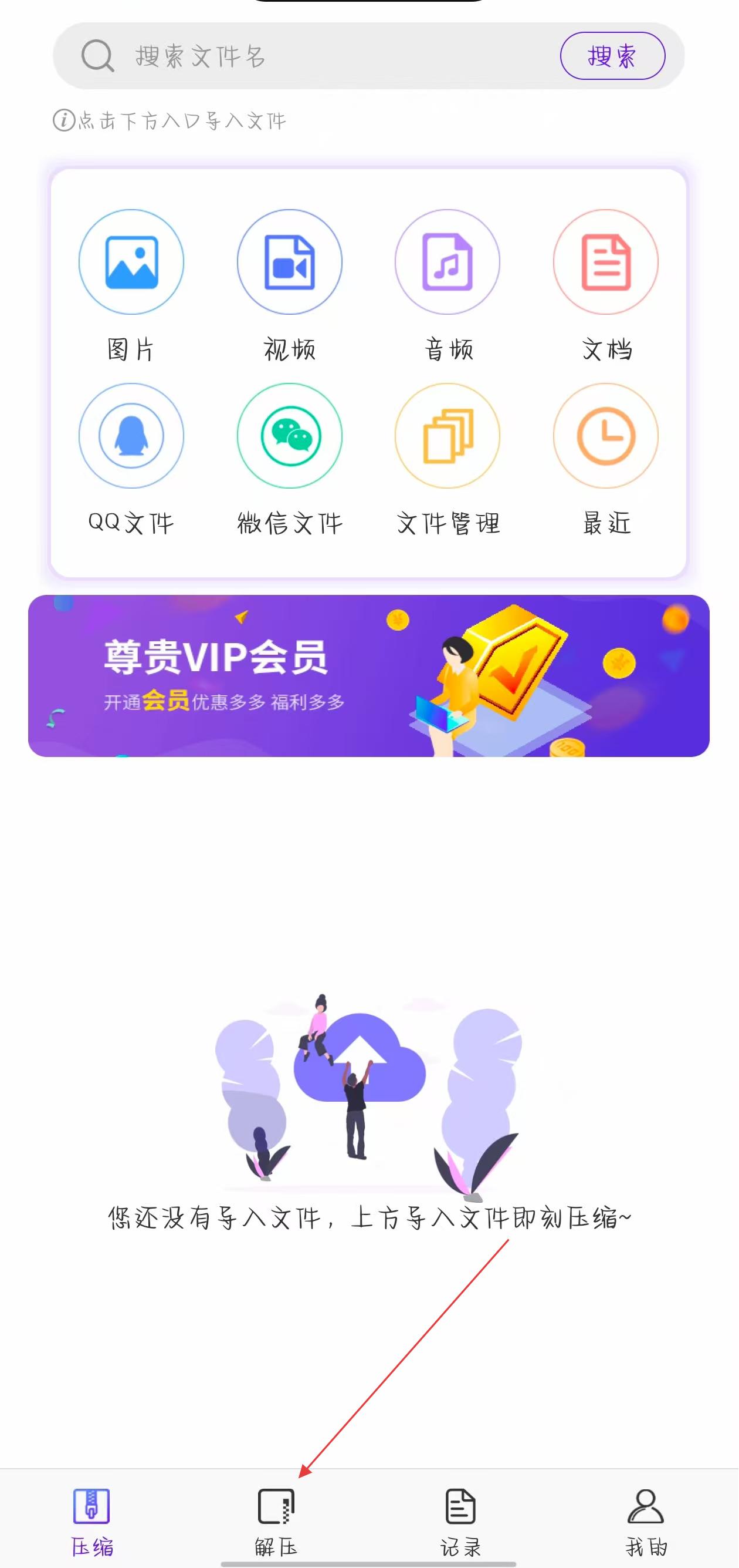 1、打開解壓縮應(yīng)用,點(diǎn)擊底部的解壓選項(xiàng),進(jìn)入壓縮文件列表頁面。