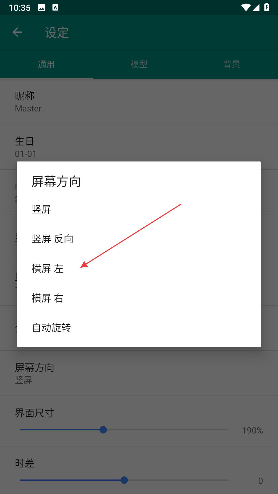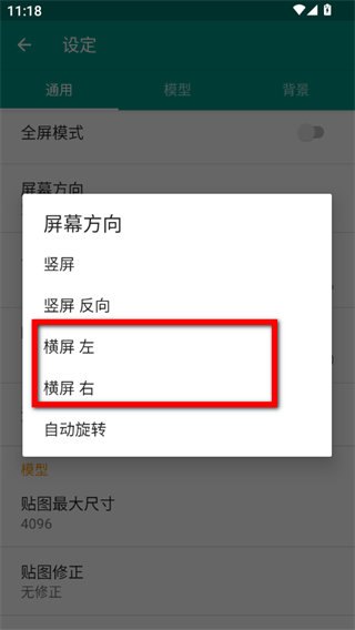 4、在屏幕方向選擇窗口中,點(diǎn)擊橫屏左或橫屏右選項(xiàng),應(yīng)用橫屏顯示設(shè)置。