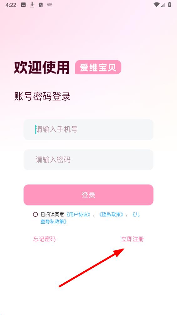1、打開愛維寶貝app,在登錄界面中點(diǎn)擊右下角的立即注冊(cè)選項(xiàng)進(jìn)入注冊(cè)頁(yè)面。