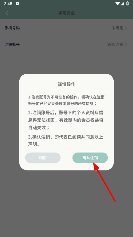 5、在彈出的謹(jǐn)慎操作提示框里點(diǎn)擊確認(rèn)注銷,完成賬號(hào)注銷操作。