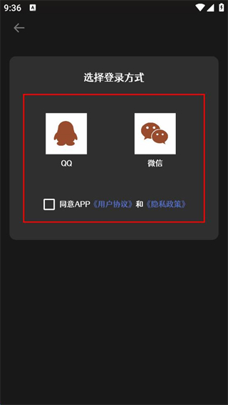 3、選擇QQ或微信登錄,勾選同意用戶協(xié)議和隱私政策后完成登錄。