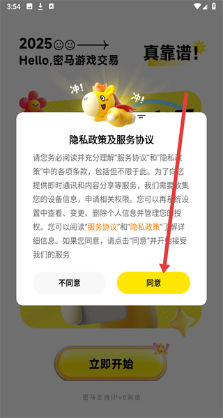 1、在密馬游戲交易APP的“隱私政策及服務(wù)協(xié)議”彈窗點(diǎn)擊“同意”,進(jìn)入主界面。