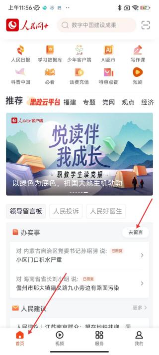 1、打開人民網(wǎng),點擊底部的首頁,在首頁界面中找到領導留言板,點擊去留言。