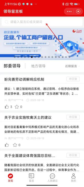 2、進入領導留言板頁面后,可看到部委領導及地方領導相關留言,也可通過輸入留言ID或關鍵詞進行搜索。