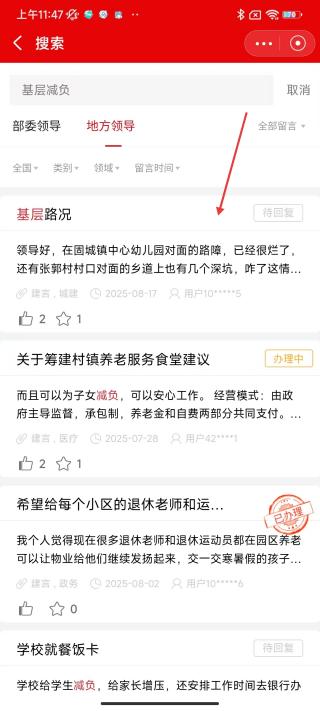 3、搜索完成后,在結果頁面點擊感興趣的留言條目,即可查看具體留言內(nèi)容及處理狀態(tài)。