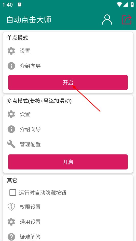 2、進(jìn)入APP主界面后,在單點(diǎn)模式區(qū)域,點(diǎn)擊“開啟”按鈕。