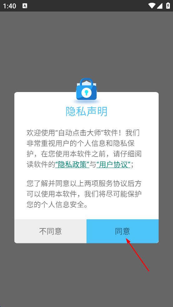 1、打開自動(dòng)點(diǎn)擊大師APP,在彈出的隱私聲明提示框中,點(diǎn)擊“同意”按鈕。