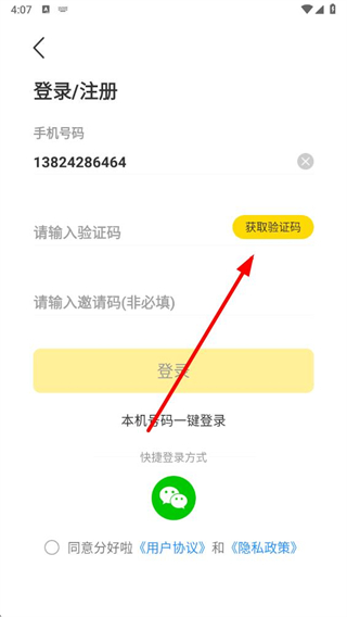 3、輸入手機(jī)號(hào)后,點(diǎn)擊獲取驗(yàn)證碼并輸入驗(yàn)證碼。