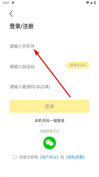 2、在登錄注冊(cè)頁面的手機(jī)號(hào)碼輸入框內(nèi),輸入手機(jī)號(hào)。
