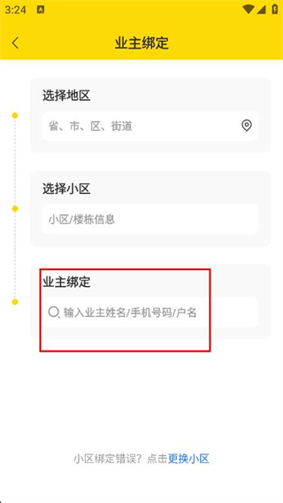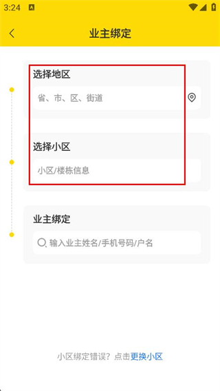 3、在業(yè)主綁定頁面,先選擇地區(qū),再選擇小區(qū)。