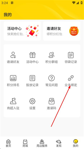 2、在我的頁面,找到并點(diǎn)擊上方的業(yè)主綁定選項(xiàng)。