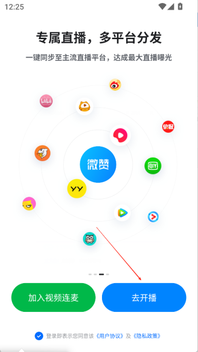 1、首先打開下載好的微贊APP,進(jìn)入軟件后會(huì)有兩個(gè)登錄類型選擇,分別是加入視頻連麥和去開播選項(xiàng),用戶根據(jù)自己的需求進(jìn)行登錄;