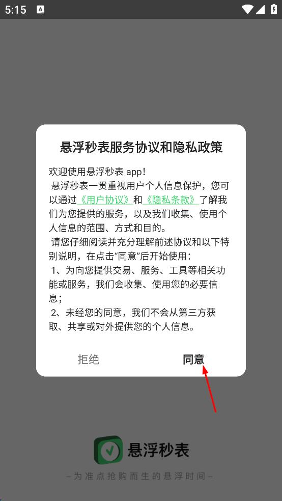 1、打開懸浮秒表軟件,彈出“懸浮秒表服務協(xié)議和隱私政策”提示框,認真閱讀相關(guān)內(nèi)容后,點擊“同意”按鈕,進入軟件的選擇平臺時間界面。