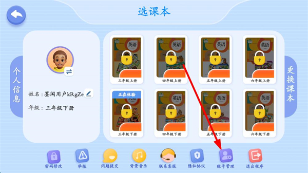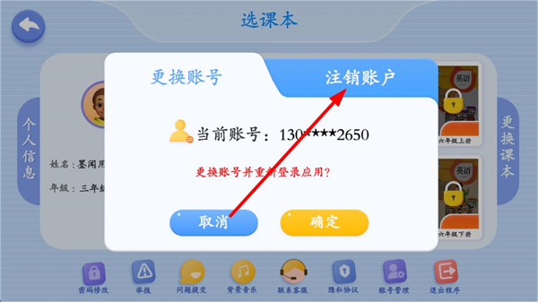 2、在選課本頁面,點擊下方賬號管理,彈出更換賬號和注銷賬戶選項。