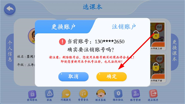 4、在注銷確認(rèn)頁面,點擊確定,即可完成PEP小學(xué)英語AR版賬號的注銷操作。