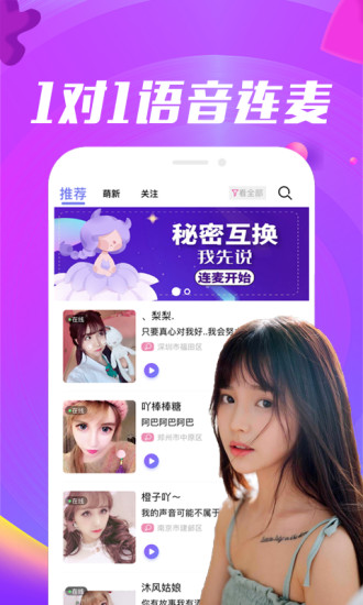 陌陌聊天:來美聊探探雙方默契值緣分值,相比視頻聊天,語音聊天保留一定的私密性,安全結(jié)交共同興趣的朋友,擴(kuò)大交際圈,不再默默一個(gè)人。