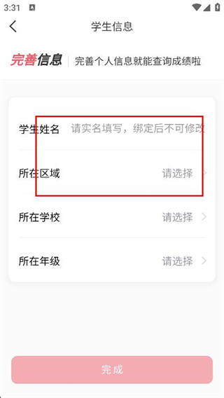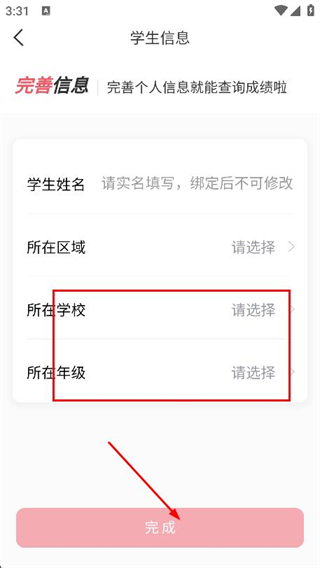 4、選擇學(xué)校和年級,點擊完成即可完成信息綁定操作。