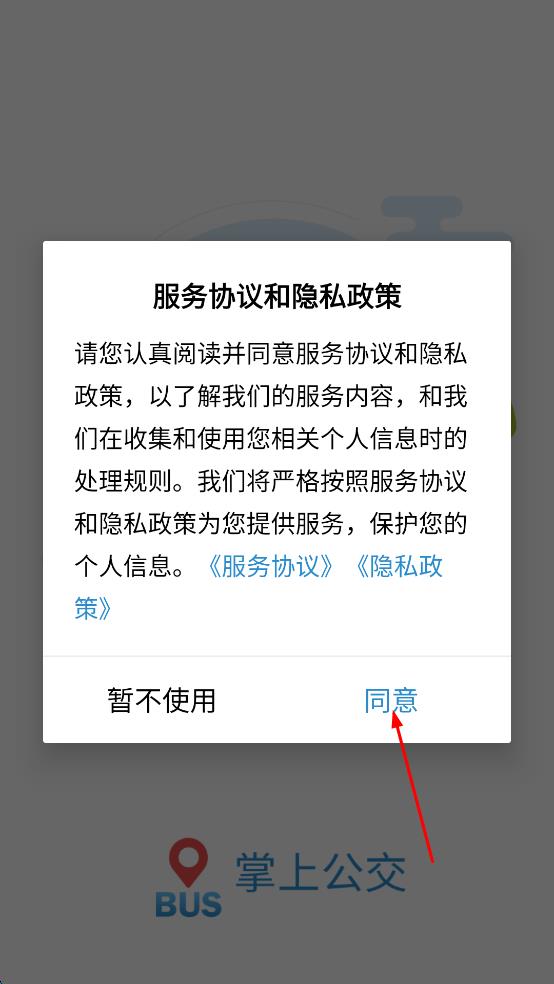 1、打開掌上公交APP,出現(xiàn)服務(wù)協(xié)議和隱私政策界面,仔細(xì)閱讀后點擊“同意”,進(jìn)入主界面。