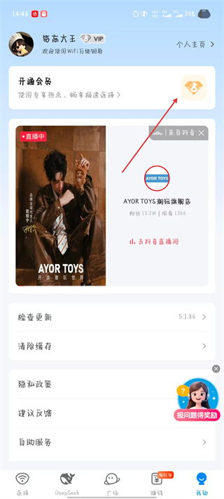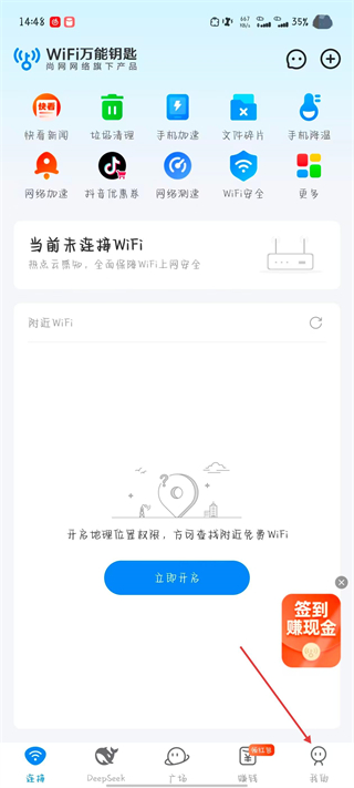 1、打開(kāi)WiFi萬(wàn)能鑰匙,點(diǎn)擊右下角我的。