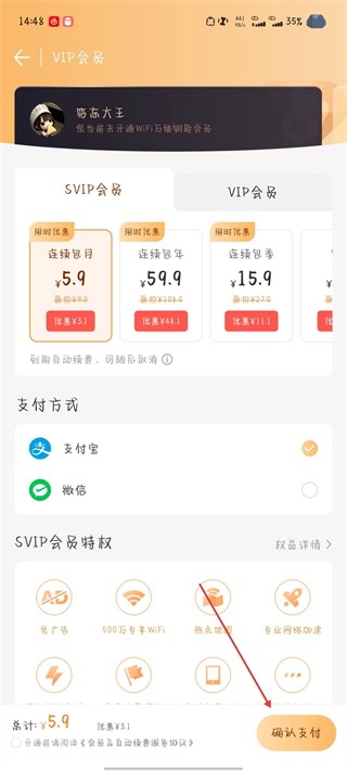 3、選擇會(huì)員類(lèi)型和支付方式,點(diǎn)擊確認(rèn)支付。