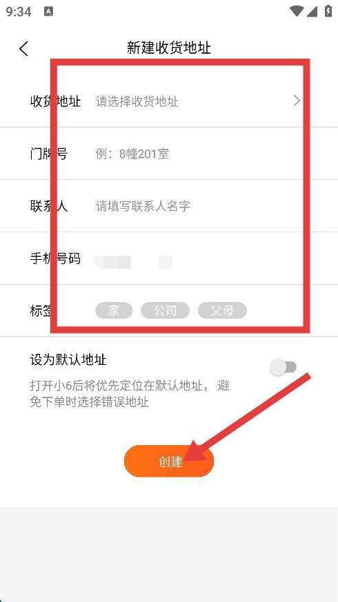 4、在新建收貨地址頁,填寫好信息,點擊創(chuàng)建完成添加。